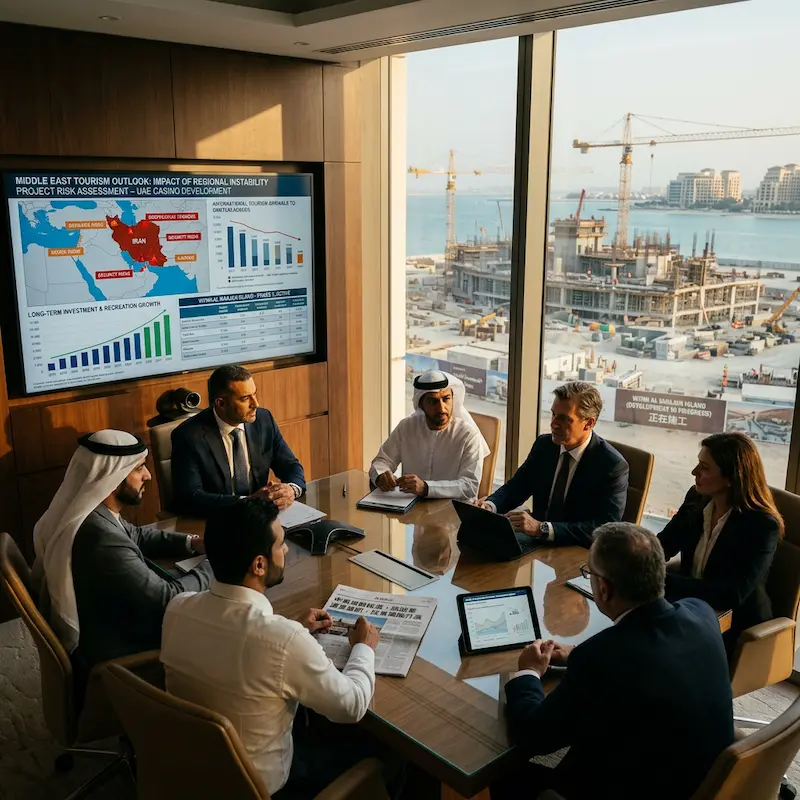 イラン情勢の緊張により、UAEなどで進むWynn等のカジノ開発プロジェクトに観光減少や運営リスクが生じている。一方で長期的な市場成長への期待は維持され、投資は継続されている。