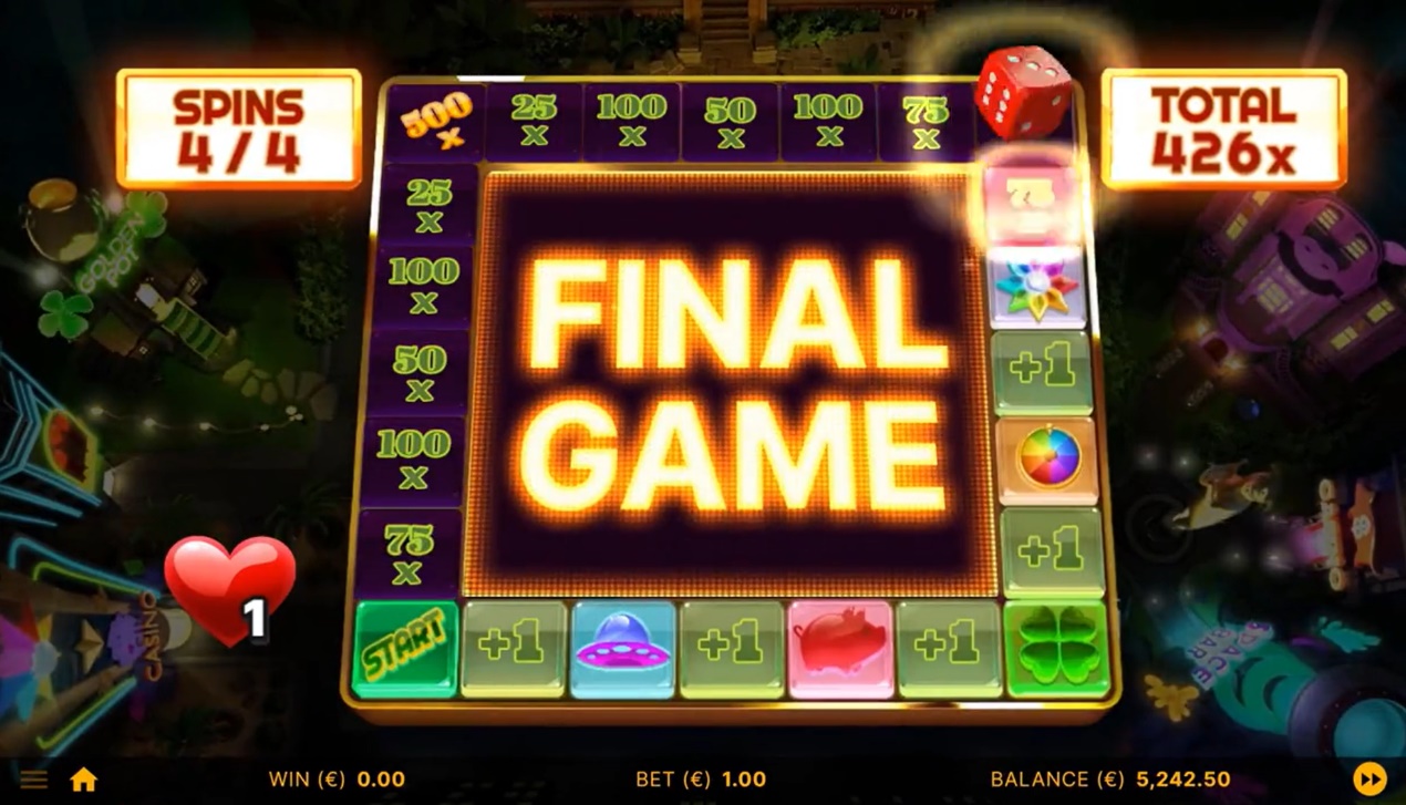 右上隅と左下隅にある 2つの正方形を除い他場所に着地するとサイコロを獲得できますが、リールの周りのゲーム ボード上のすべての正方形には、25x、50x、75x、100x、500x、または1,000xのマルチプライヤーが与えられます。 、。