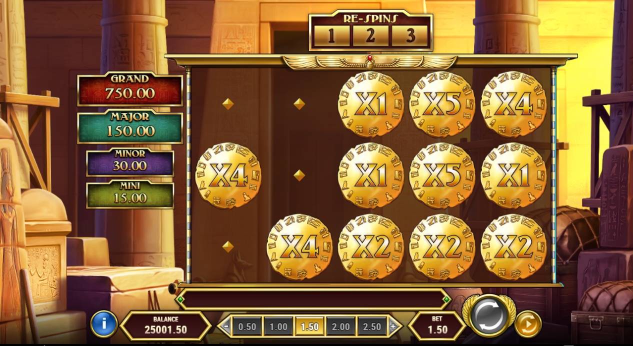フリースピン開始前に、通常のシンボル(トゥーム・スキャッターを除く)の1つがフリースピン中、拡張シンボルとして選択され、金色のタイルで識別できます。