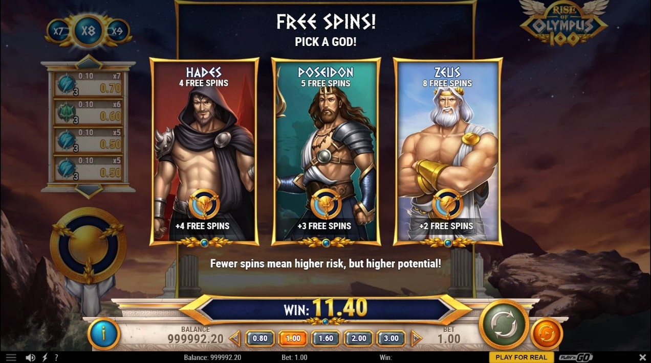 ハデス、ポセイドン、ゼウスは、それぞれ追加で 4 回、3 回、2 回のフリースピンを獲得できます。