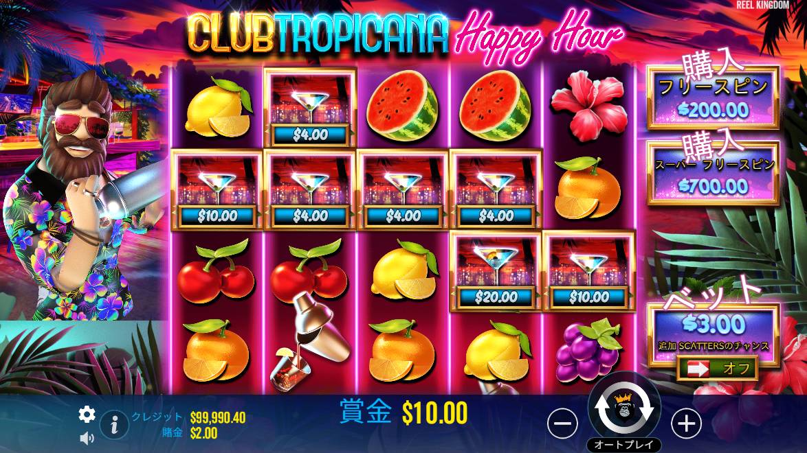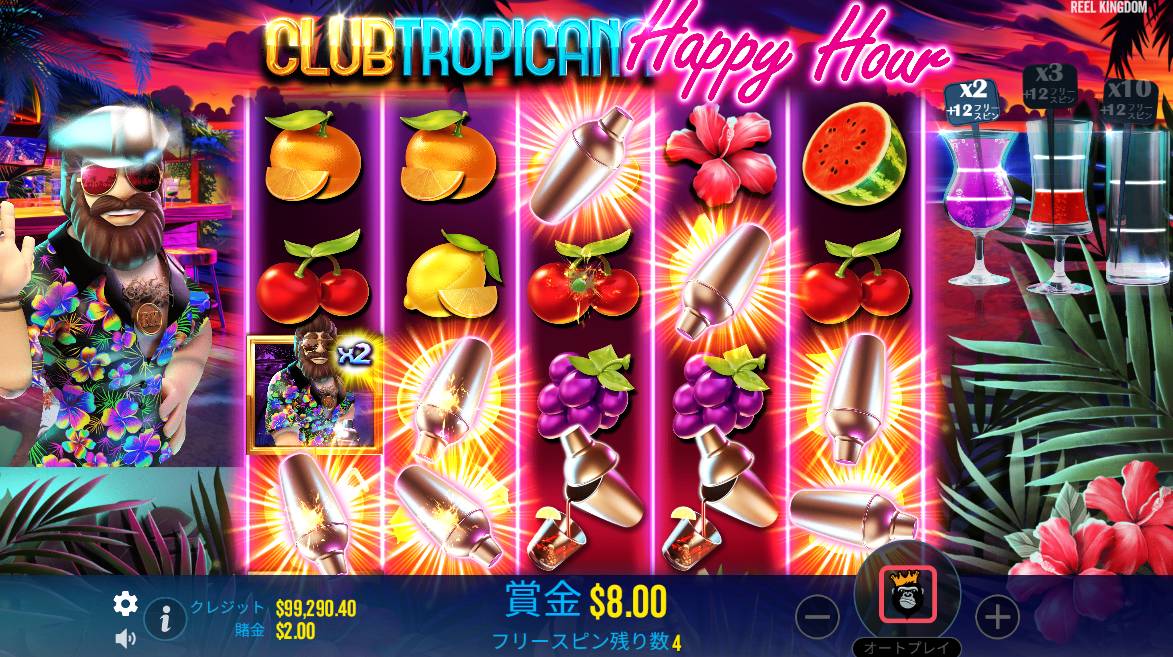『Club Tropicana – Happy Hour』は、最大5000倍のマネーシンボル、プログレッシブフリースピントレイル、キャッシュを集めるバーテンダーワイルドを特徴としています。