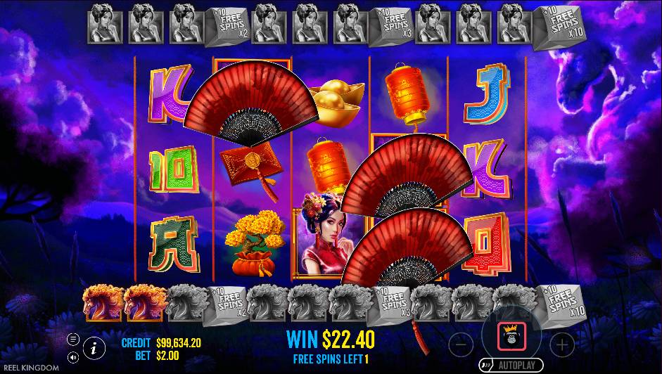 ワイルドシンボルが存在するもののコインが出ない場合は、扇子がスピン終了時にランダムな位置にマネーシンボルを追加します。