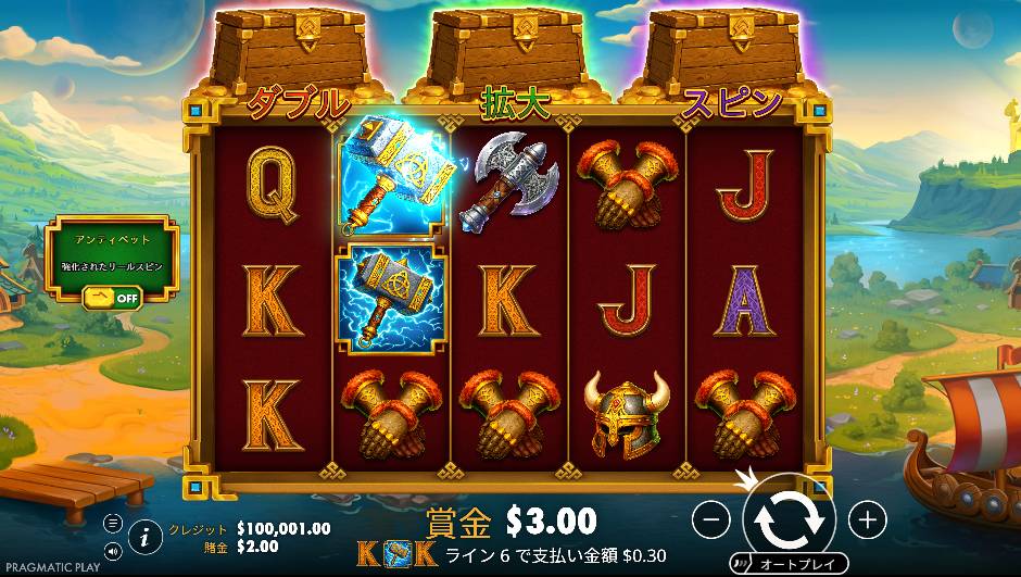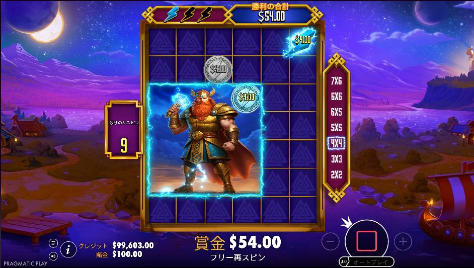稲妻に囲まれたミョルニルはワイルドシンボルとして機能し、ペイライン勝利の評価時にすべてのシンボルの代わりとなります。