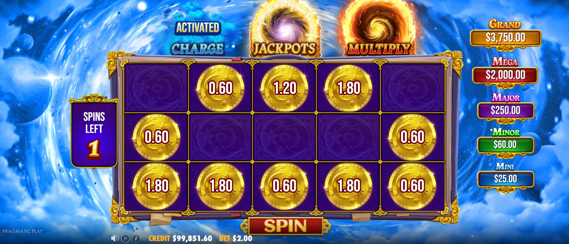 リール上部のチャージスタッシュに集められ、リスピンを発動する場合があります。チャージモディファイアが有効な状態でリスピンが有効な場合、ブルーオーブが着地するたびに画面上のマネーシンボルがランダムに選択され、リスピンごとにランダムな金額で価値が増加します。増加幅はベット額の0.3倍から25倍までです。