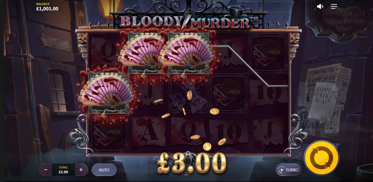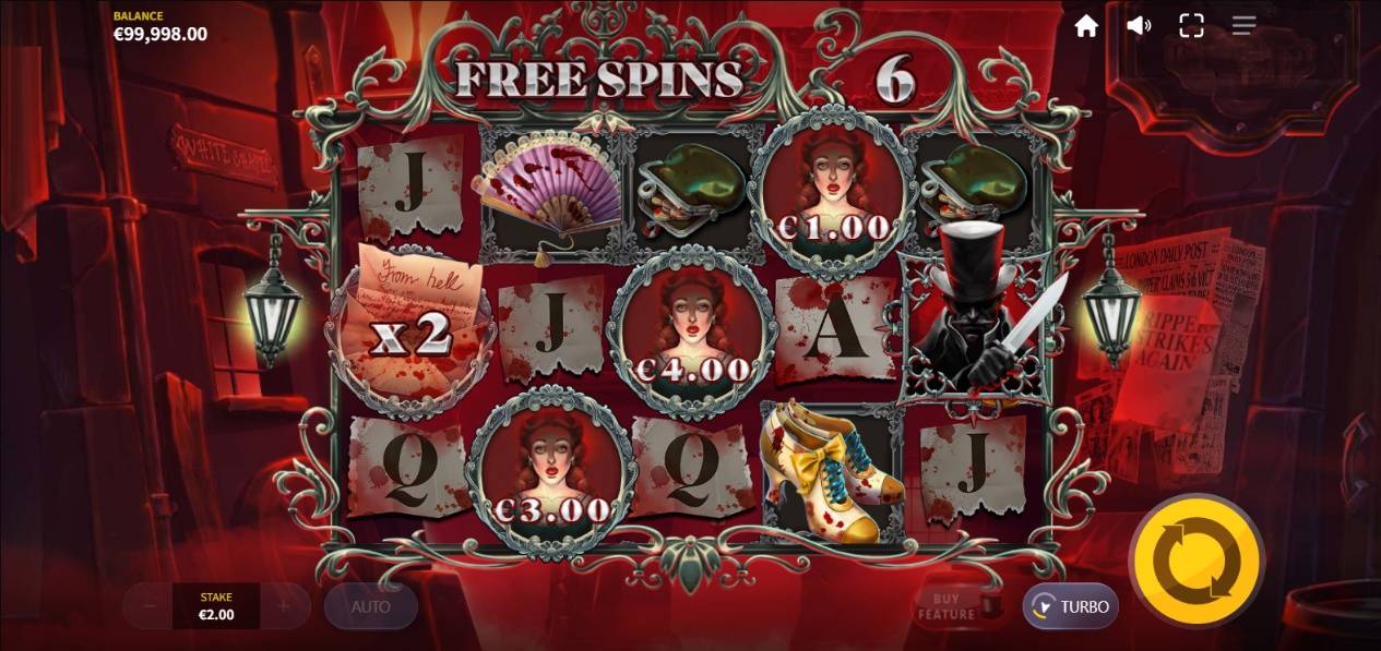 血まみれの文字のシンボルが、犠牲者シンボルとリッパーシンボルと共に同じスピンで出現した場合、このマルチプライヤーはリッパーシンボルの合計賞金に適用されます。